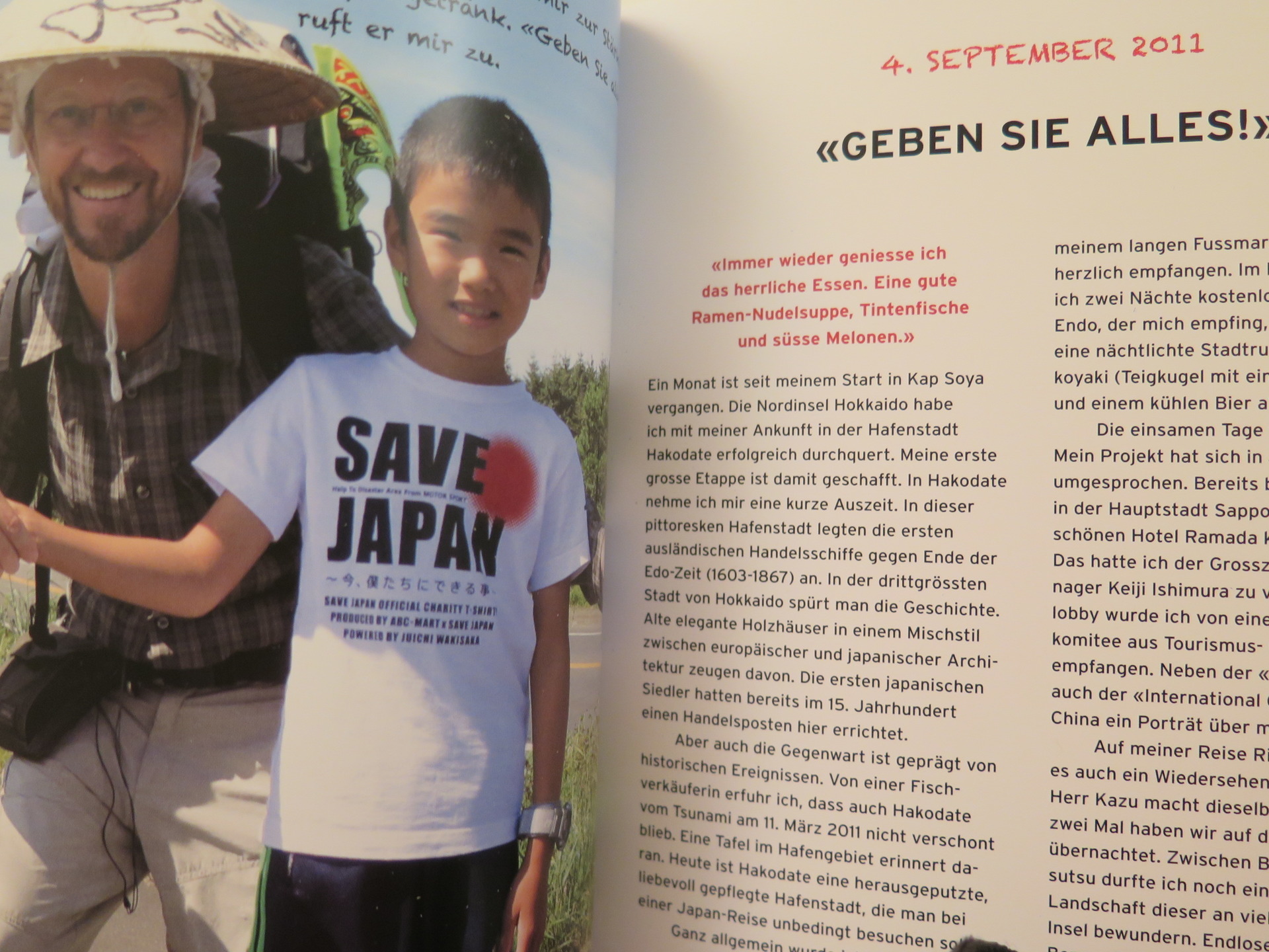 Schliesslich geht er 2900 Kilometer zu Fuss von der Nord- bis zur Südspitze (Kyushu) Japans. Sein Marsch bei Sonne, Regen, Sturm und Hitze wird zur Reise der Hoffnung. In einem täglichen Blog zeigt er der Welt, dass Japan weit mehr als Fukushima ist. «Negativ: nichts», vermeldet er jeweils am Ende des Tages. Die Japaner danken es ihm.